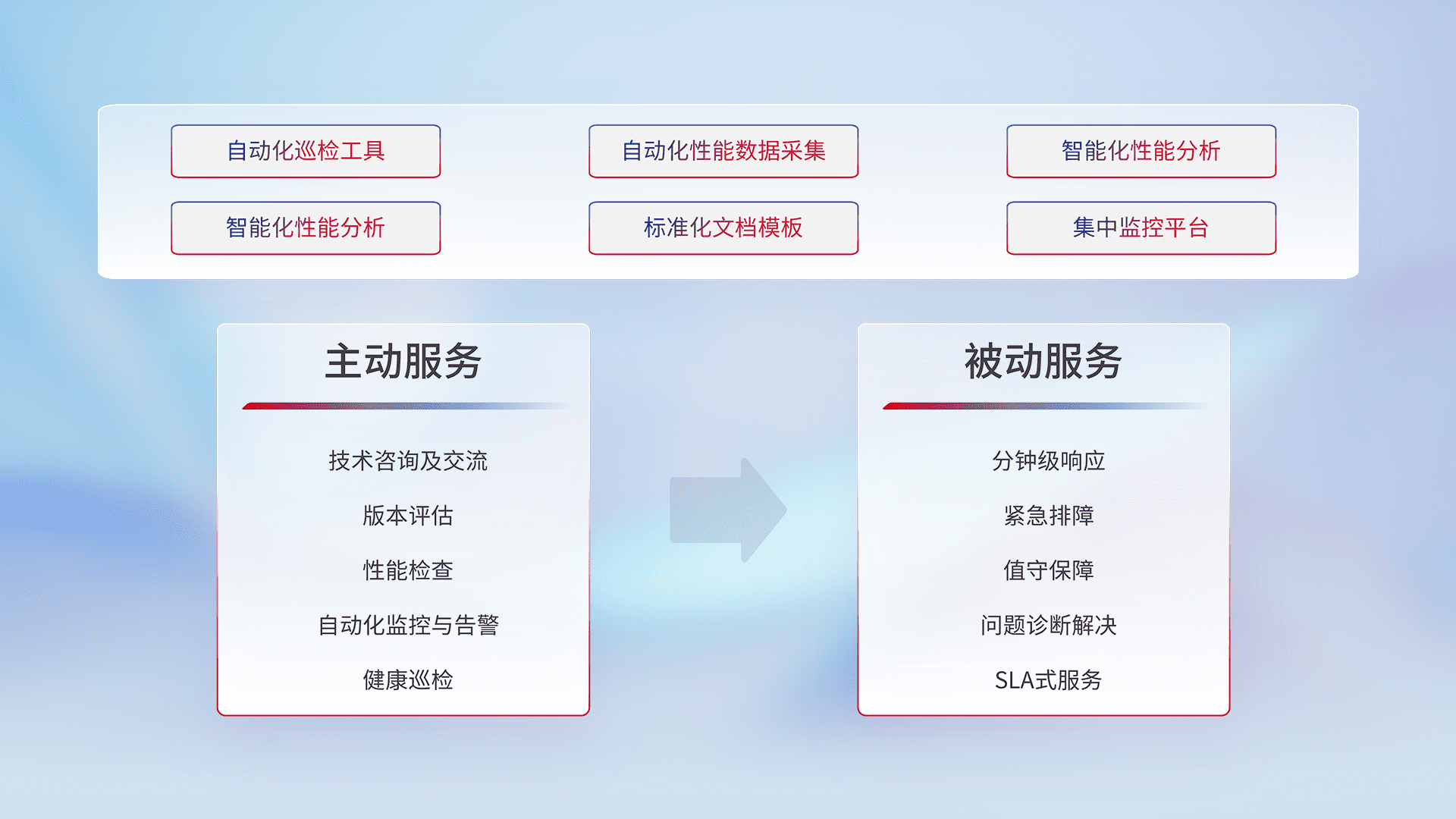 智能化工具和标准化文档,,,,保障服务质量,,,,提供主动服务(包含技术咨询、、、版本评估、、、、性能检查、、自动化监控与告警、、、、健康巡检)和被动服务包含(分钟级响应、、、、紧急排障、、值守保障、、、问题诊断解决、、SLA服务)。。。